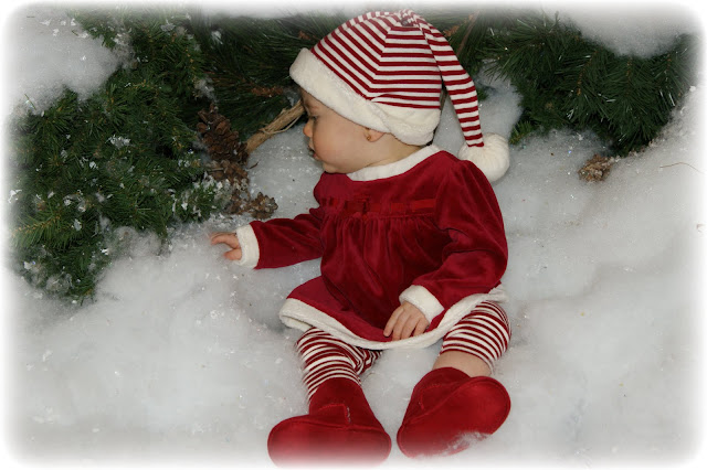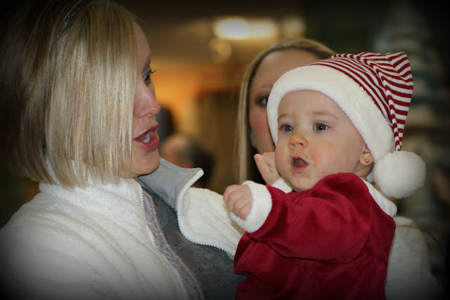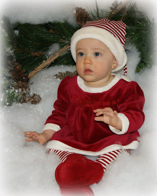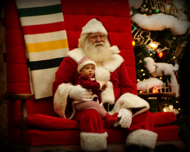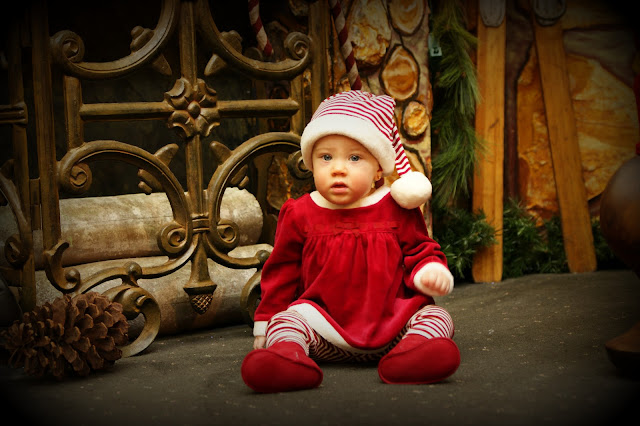 Ok... I'm gonna start out by saying this... now that Charlee is older she has started this thing where if someone she doesn't know or hasn't seen in a while gets close to her or in her face she cries... So I thought for sure sitting her on Santas lap and leaving her would make her freak out and start screaming... I think this is the most nervous I have been since I have had Charlee, but man was I wrong THANK GOD... I sat her on his lap and walked away... she looked at me, then looked at Santa right in the face, smiled then started dancing. It was one of the funniest things I have seen her do. Priceless...
